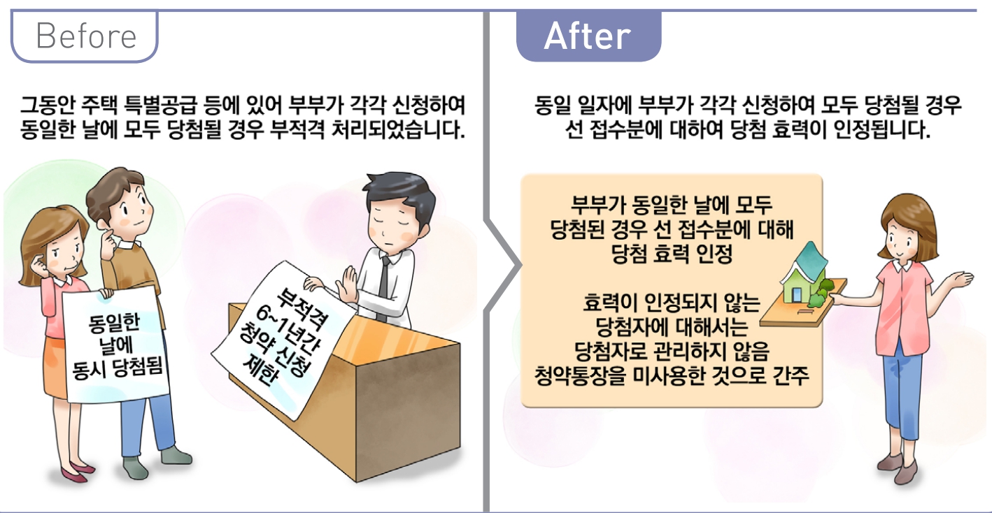 => (개선) 부부가 당첨자 발표일이 같은 청약에 모두 당첨되었으나 둘 다 당첨 효력이 인정되지 않는 경우 먼저 신청한 주택에 대하여 당첨 효력 인정하고 후신청해서 당첨된 것은 부적격 처리를 하지 않고, 당첨자로 관리하지 않으며, 청약통장을 미사용한 것으로 간주
